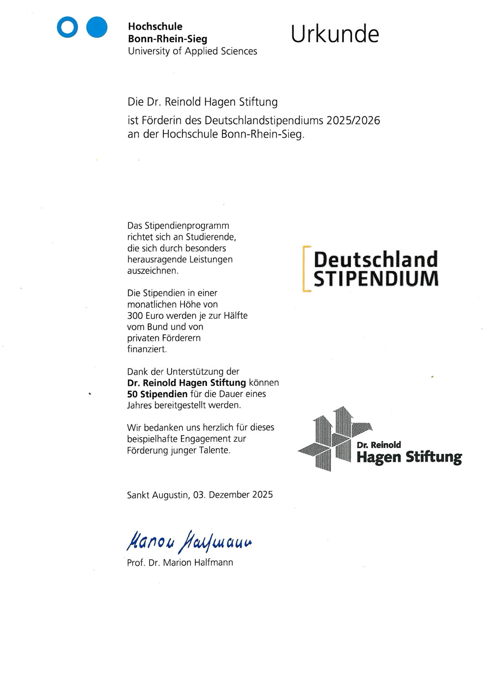 Am 3. Dezember 2025 wurde die Dr. Reinold Hagen Stiftung bei der feierlichen Stipendienübergabe der Hochschule Bonn-Rhein-Sieg als Premiumförderer des Deutschlandstipendiums 2025/2026 gewürdigt. In diesem Jahr können insgesamt 129 Deutschlandstipendien an Studierende vergeben werden – ein schöner Erfolg, den die Hochschule gemeinsam mit Fördernden und Stipendiat:innen feierte. Die Dr. Reinold Hagen Stiftung unterstützt davon 50 Stipendien im MINT-Bereich und fördert damit gezielt junge Talente.